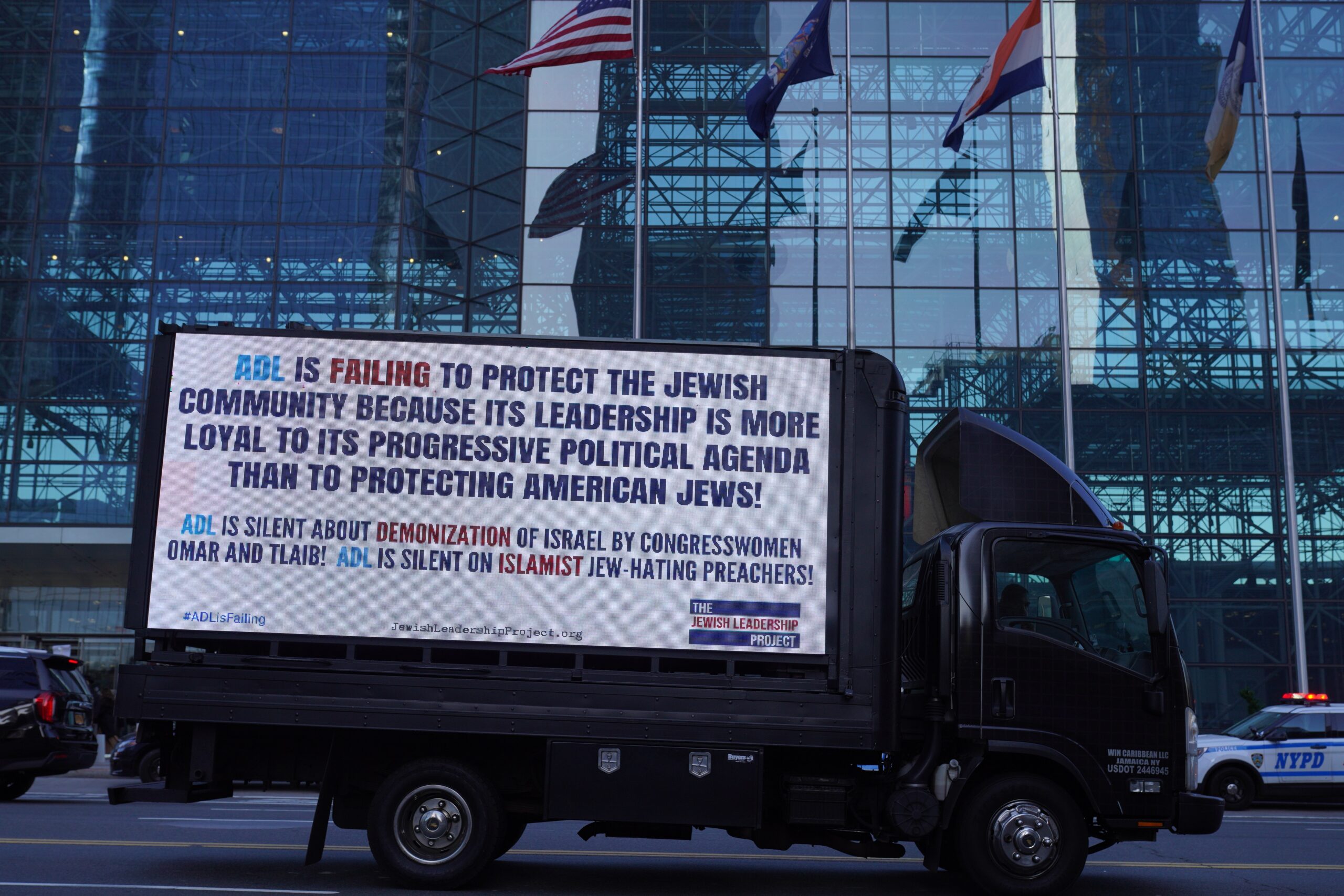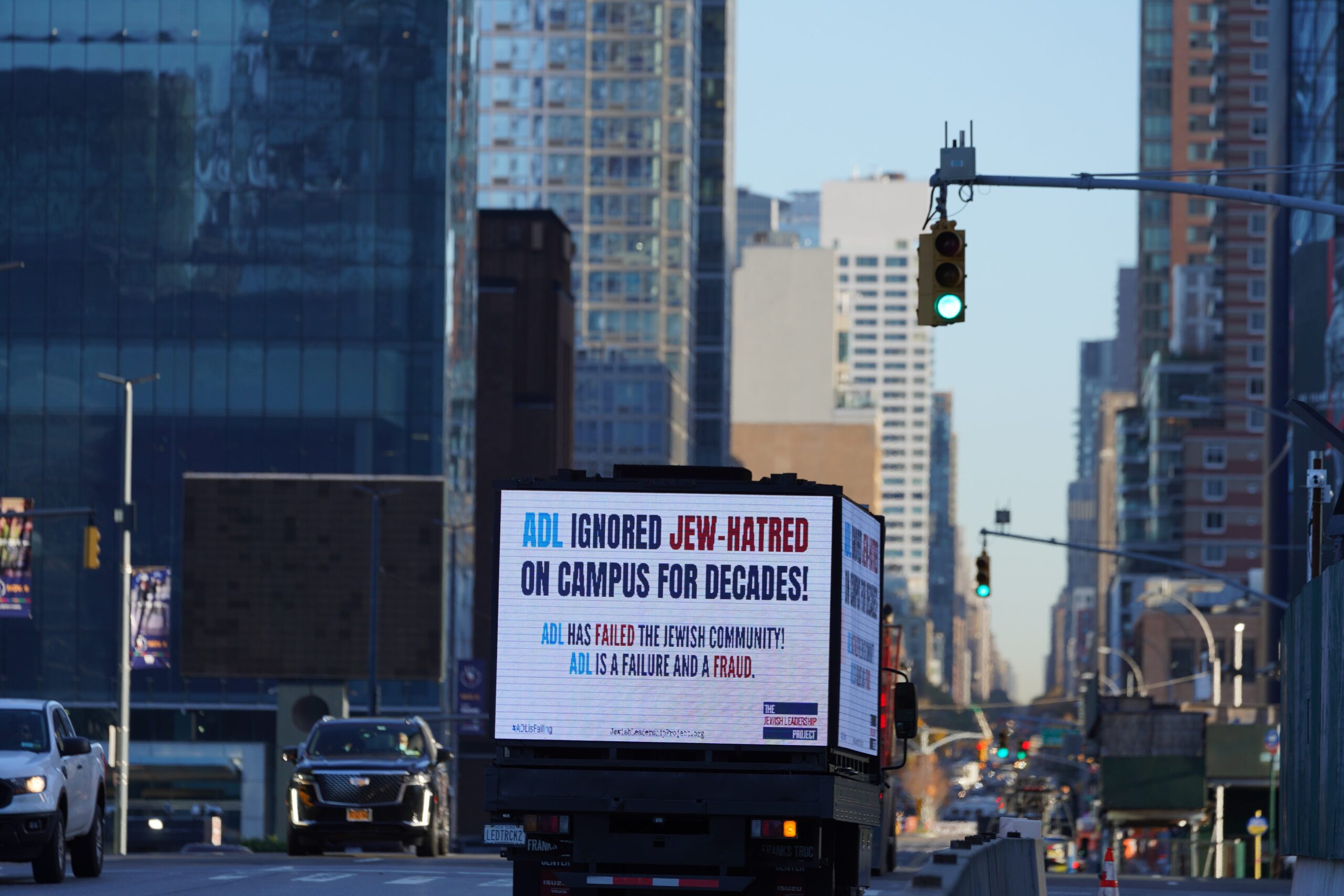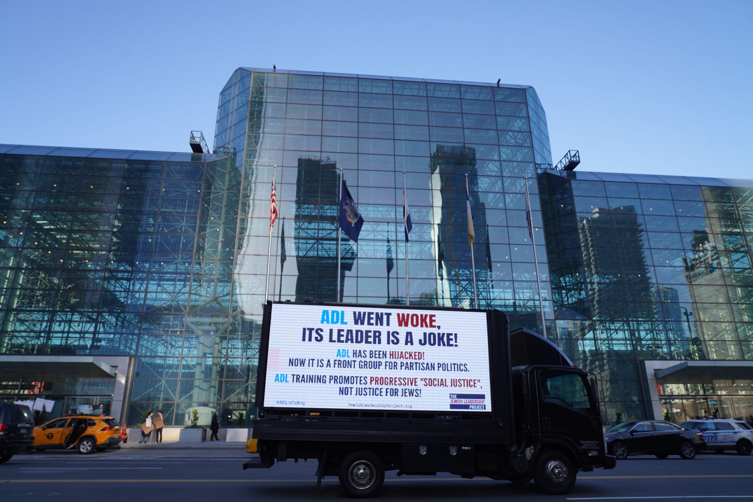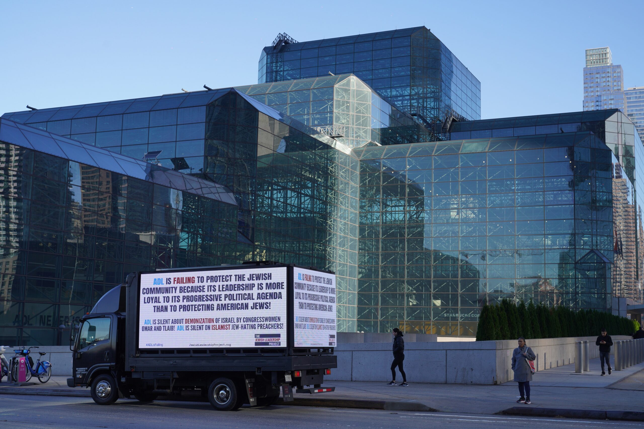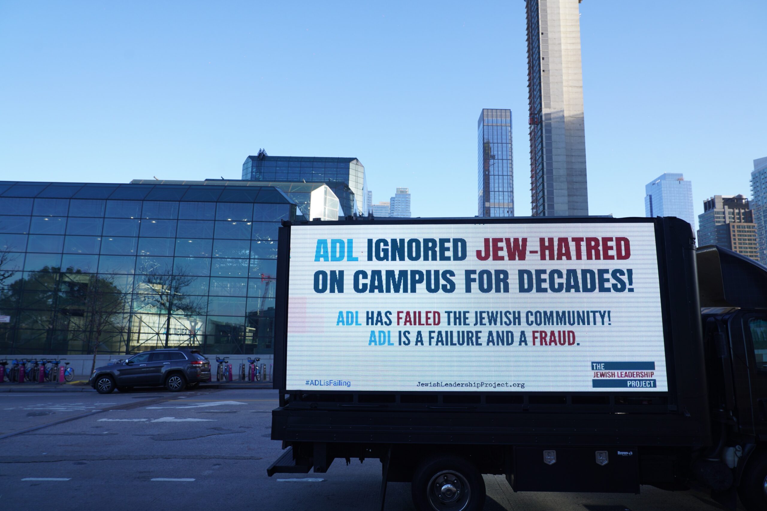 On Thursday, November 10, the Jewish Leadership Project “picketed” the ADL’s national conference in New York City with an ad-truck parked in front of the venue and drove through the streets of Manhattan with the following messages: