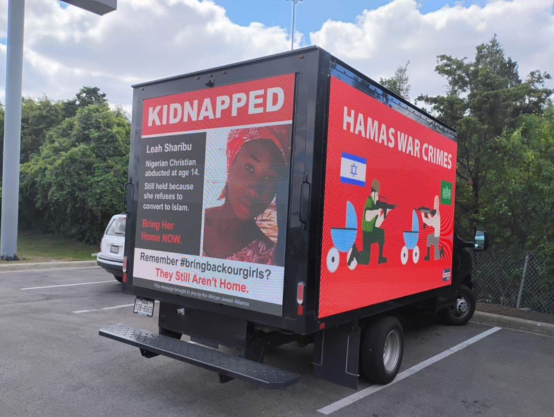 It showed graphics informing passersby of the fact that jihad is occurring not only in Israel but in Africa, where Hamas’s Nigerian counterpart, Boko Haram, massacres and kidnaps innocent Nigerians daily. This includes Nigerian slave-hostage Leah Sharibu, who has been in captivity for more than six years.
